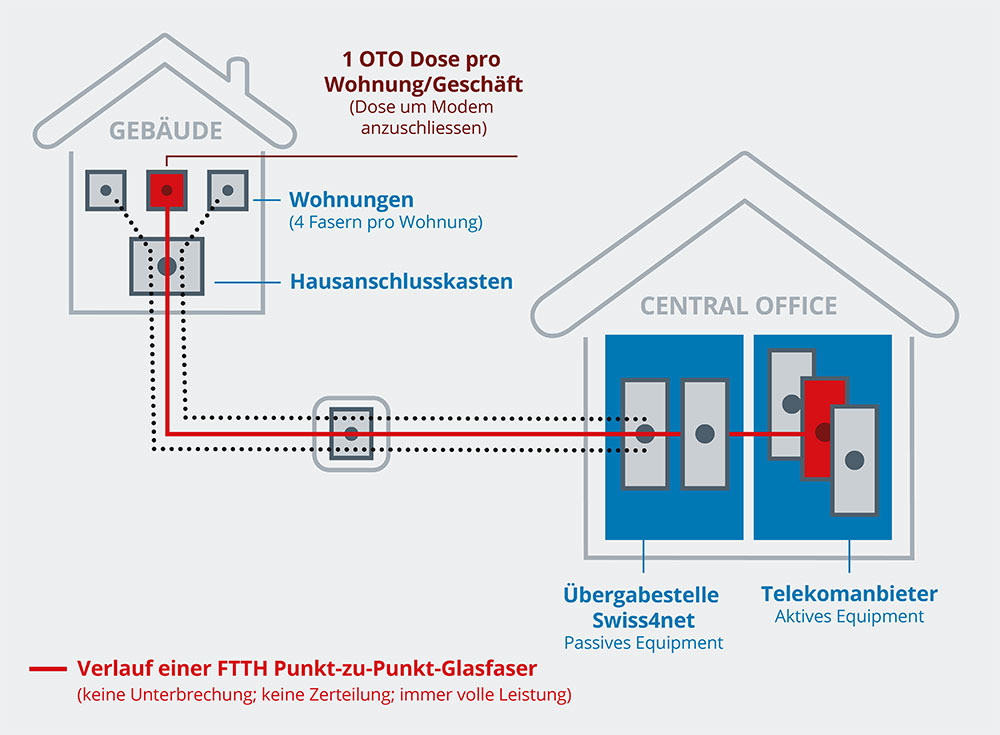 Das Glasfasernetz bietet eine zukunftssichere Infrastruktur für Wohn- und Geschäftsliegenschaften. Jede Wohn- oder Geschäftseinheit verfügt über genügend Glasfasern, die direkt von der Zentrale bis zur optischen Telekommunikationsdose (OTO-Dose) geführt und aufgeschaltet sind. Dadurch erhält jede Einheit eine eigene direkte Verbindung, ohne Bandbreitenteilung oder Leistungsverlust – unabhängig von der Nutzung durch andere Parteien.